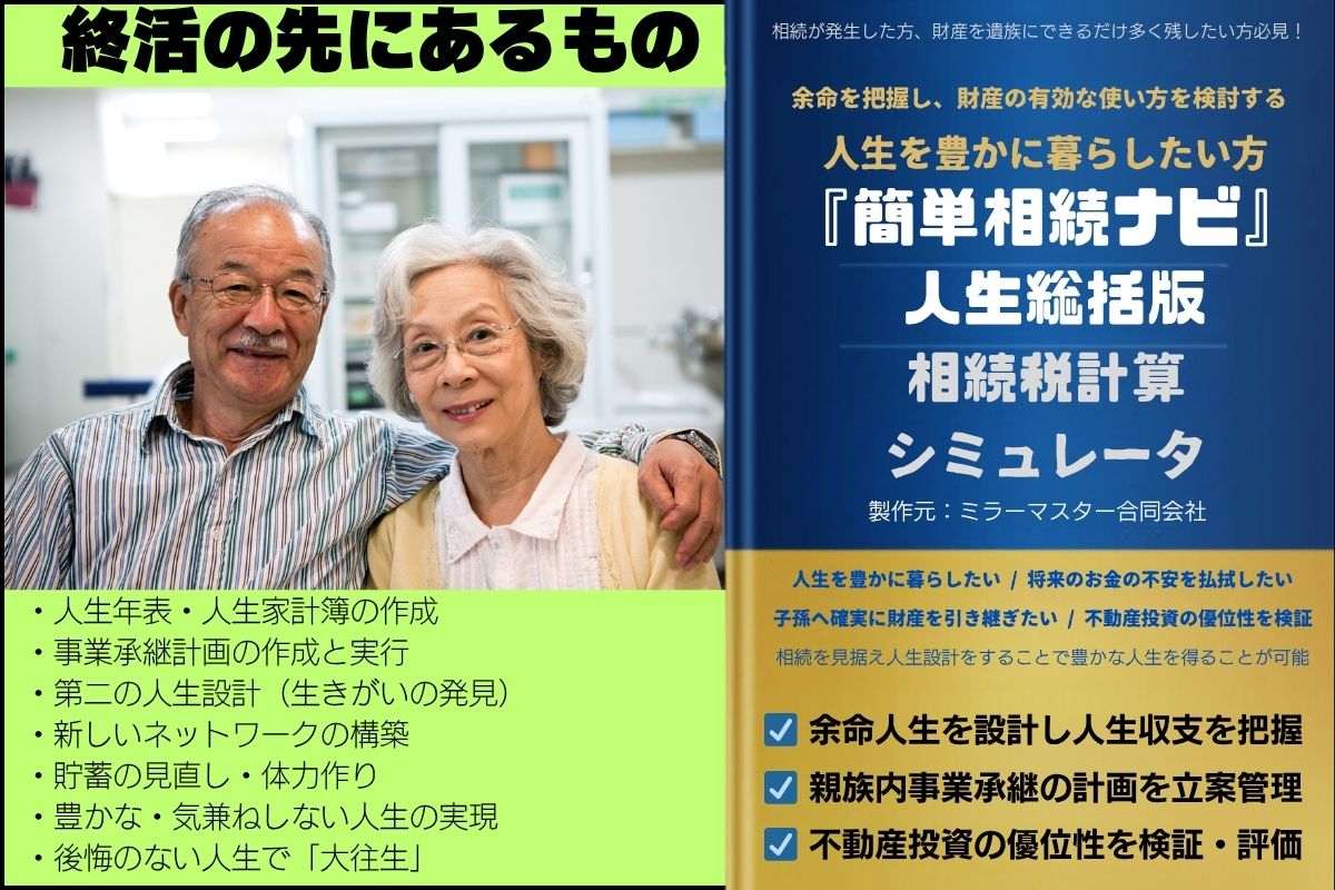- 『簡単相続ナビ』を使用することにより、最大36.5万円で相続が良く判らない方でも自分の思い通りのシミュレーションが実現できます。